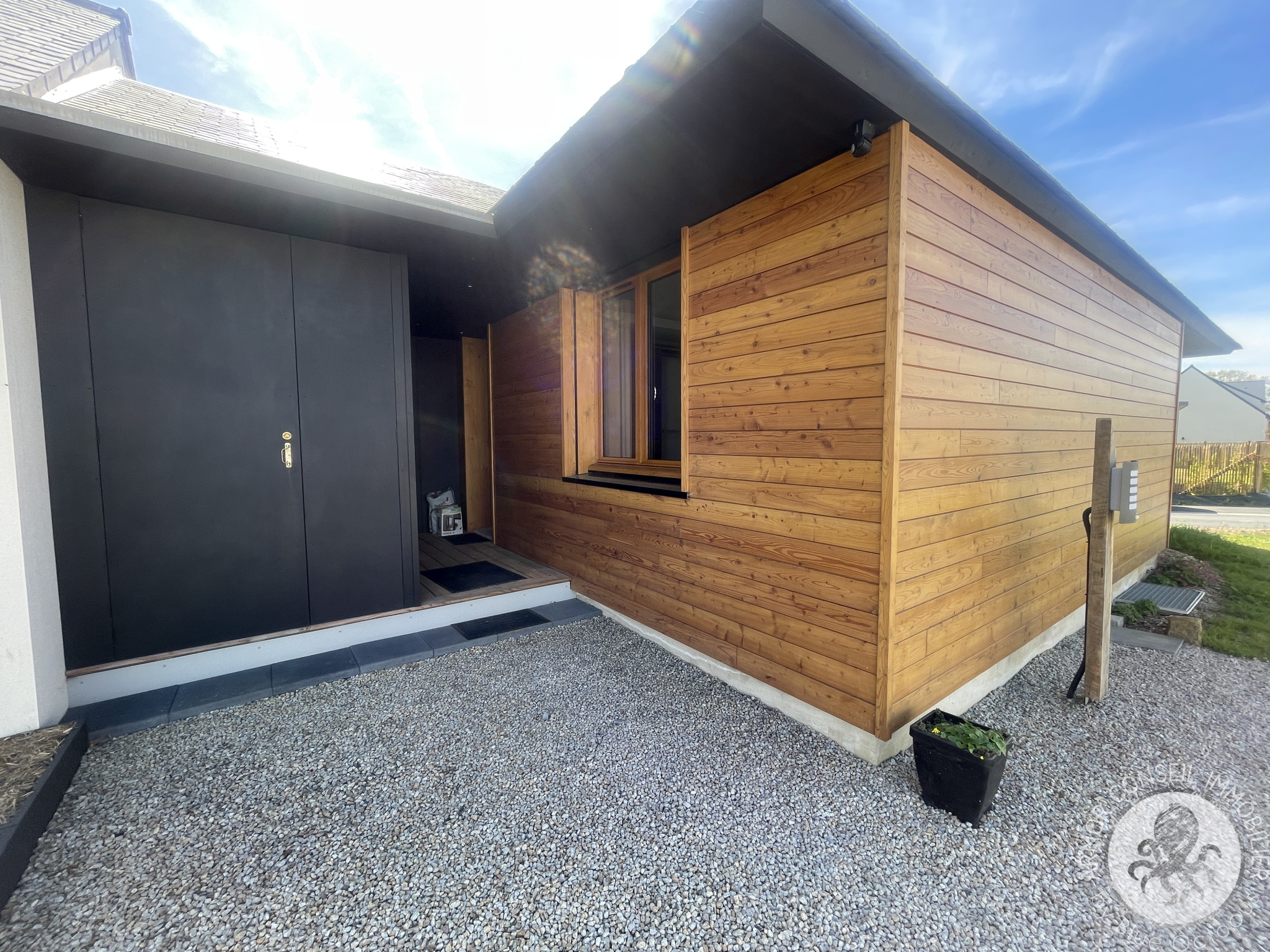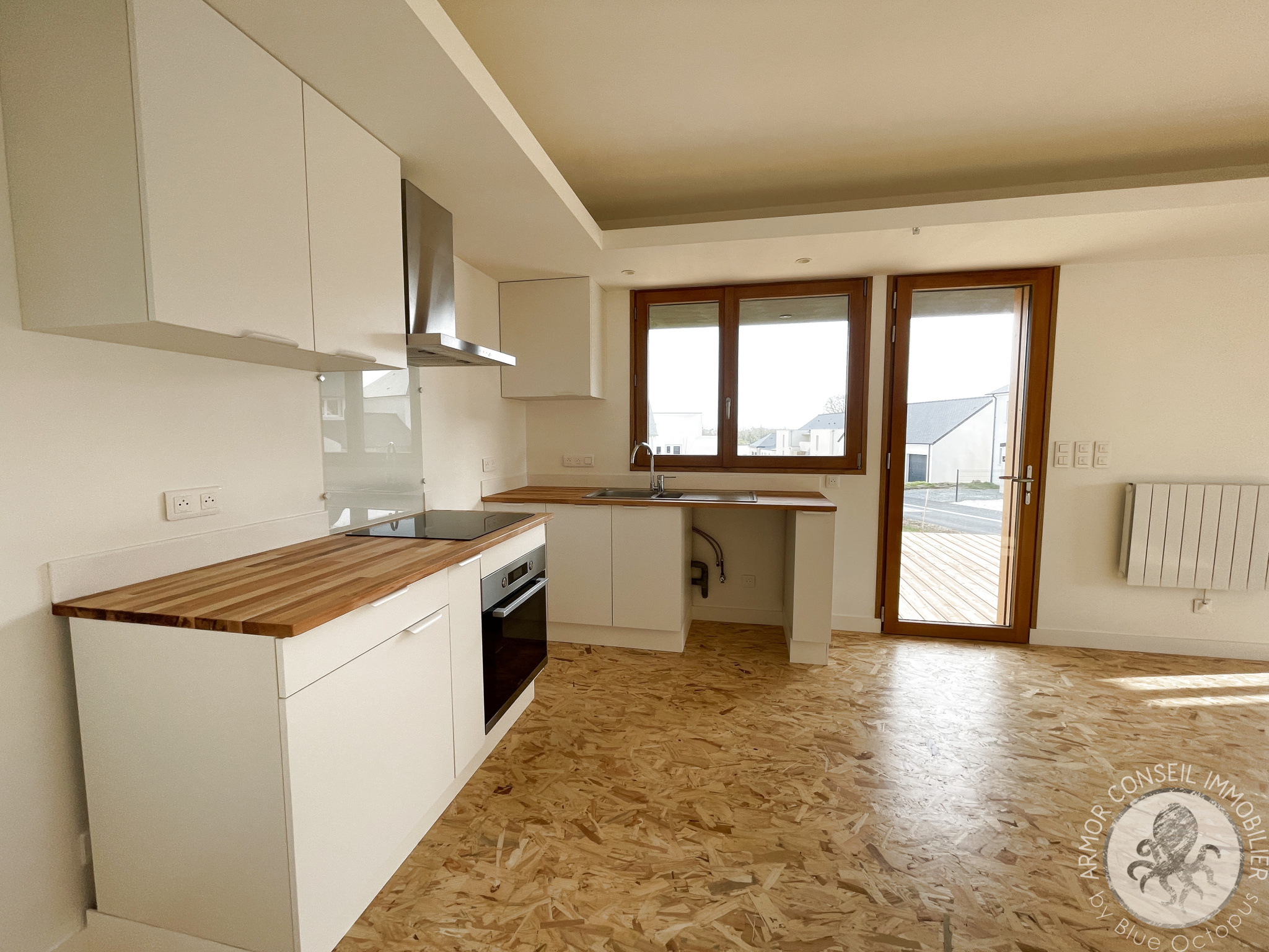 Matignon (22550)ARMOR CONSEIL IMMOBILIER: Clotilde CALVARY vous présente cette charmante maison en bardage bois d'une surface habitable de 66.82 m², fonctionnelle, chaleureuse et économique, idéale pour un cadre de vie confortable à proximité des commerces et écoles. Elle offre une faible consommation d'énergie. Vous découvrirez une entrée-dégagement avec placards, une belle pièce de vie lumineuse avec cuisine aménagée et équipée (four, plaques induction et hotte) ainsi qu'un poêle à granulés, deux chambres avec placards, une salle d'eau avec douche italienne. A l'éxterieur: une agréable terrasse en bois sur pilotis (garde corps en cours d'installation) avec vue sur un jardin. Un local à vélo, une remise avec espace buanderie ainsi que deux emplacements de stationnement devant la maison viennent compléter ce bien. Le tout sur un terrain de 500 m² (clôture en cours d'aménagement).