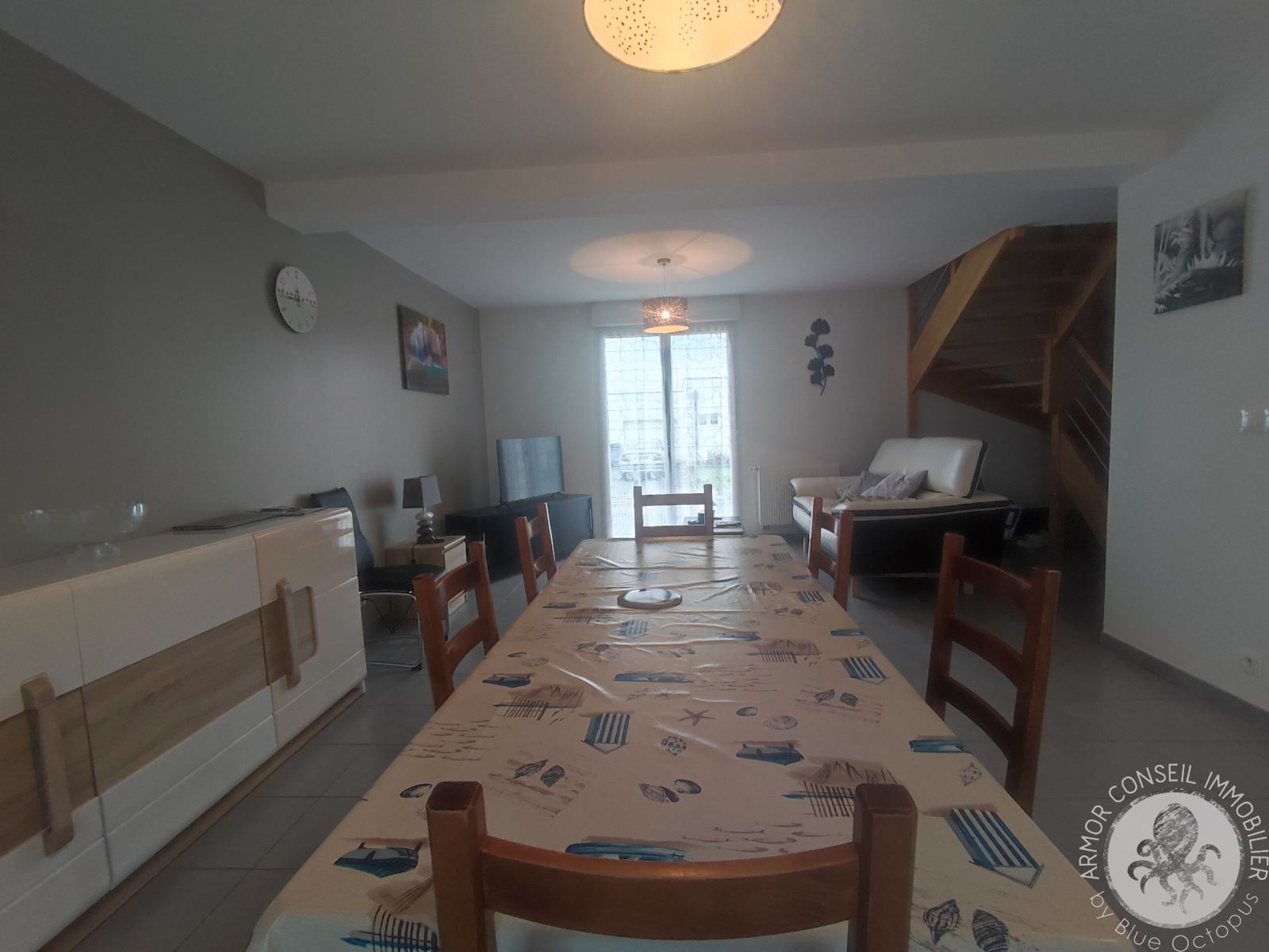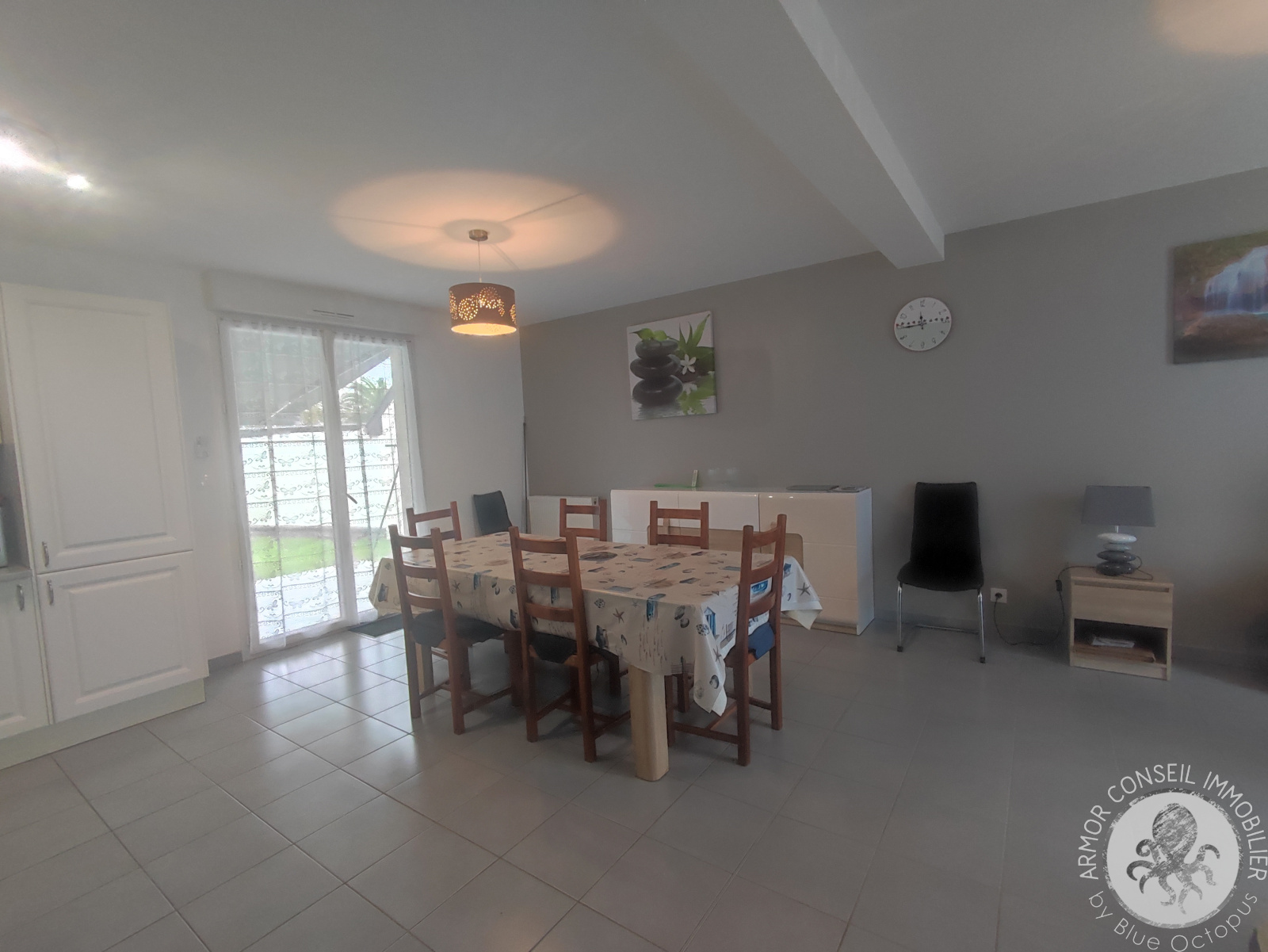 Matignon (22550)ARMOR CONSEIL IMMOBILIER: Située en centre-bourg de Matignon et à 5 minutes des Plages, jolie maison contemporaine MEUBLEE offrant au rez-de-chaussée une cuisine entièrement aménagée et équipée ouverte sur un grand salon/séjour lumineux, une chambre (lit 160x200) avec salle d'eau privative , un WC indépendant, garage attenant. A l'étage, une chambre avec lit double (160x200) et deux chambres avec chacune deux lits simples (90x200) , une salle d'eau et un WC indépendant.