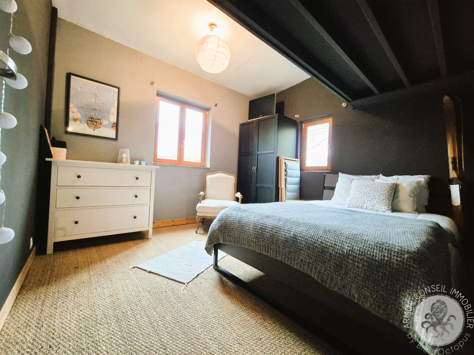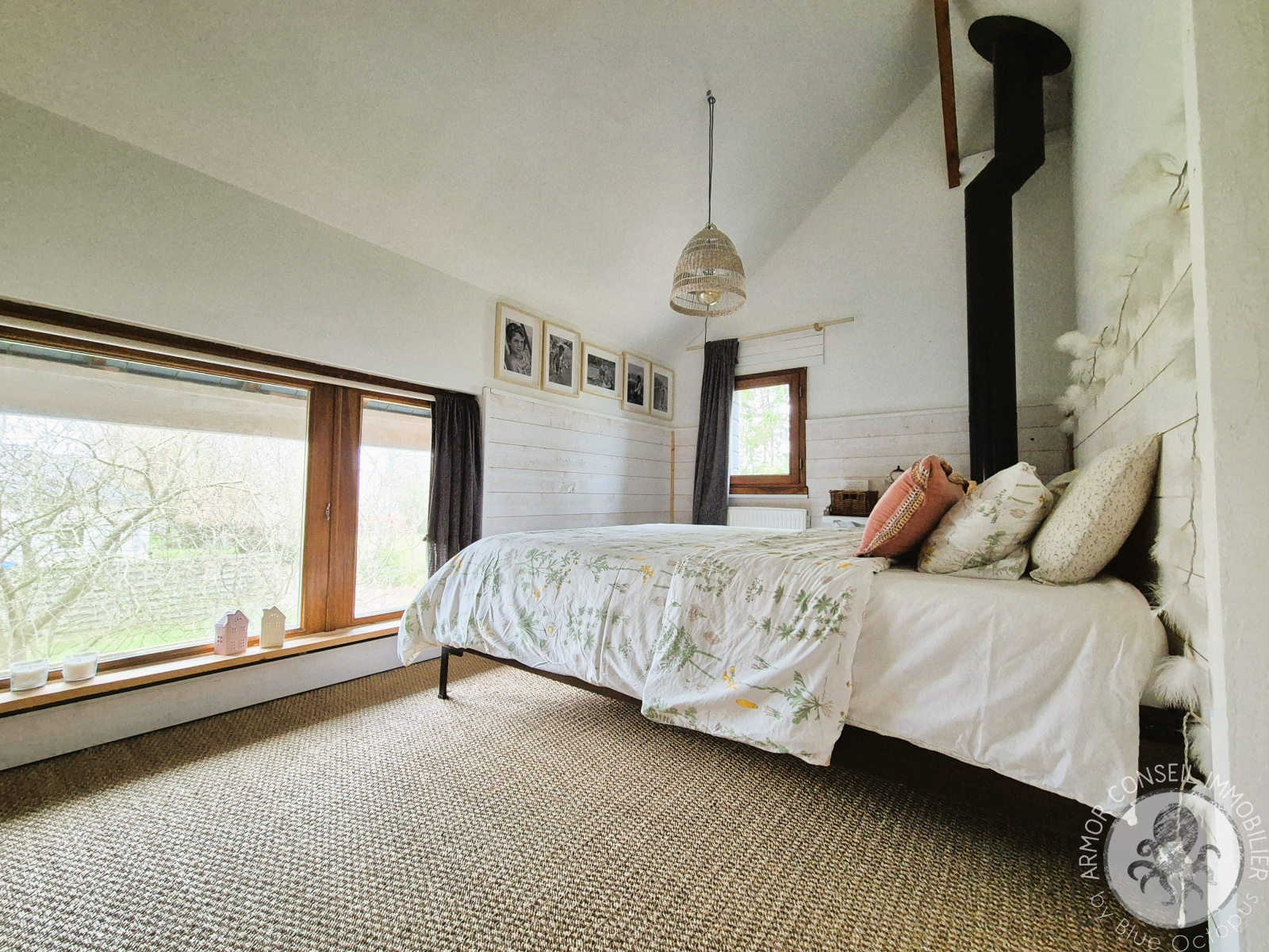 Implantée sur une parcelle de 756 m², elle se compose au rez-de-chaussée d’une entrée baignée de lumière grâce à ses larges baies vitrées, trois chambres, deux salons équipés de poêles à bois Aäsgard, une cuisine moderne, une buanderie, une salle d’eau ainsi que d’un WC indépendant.