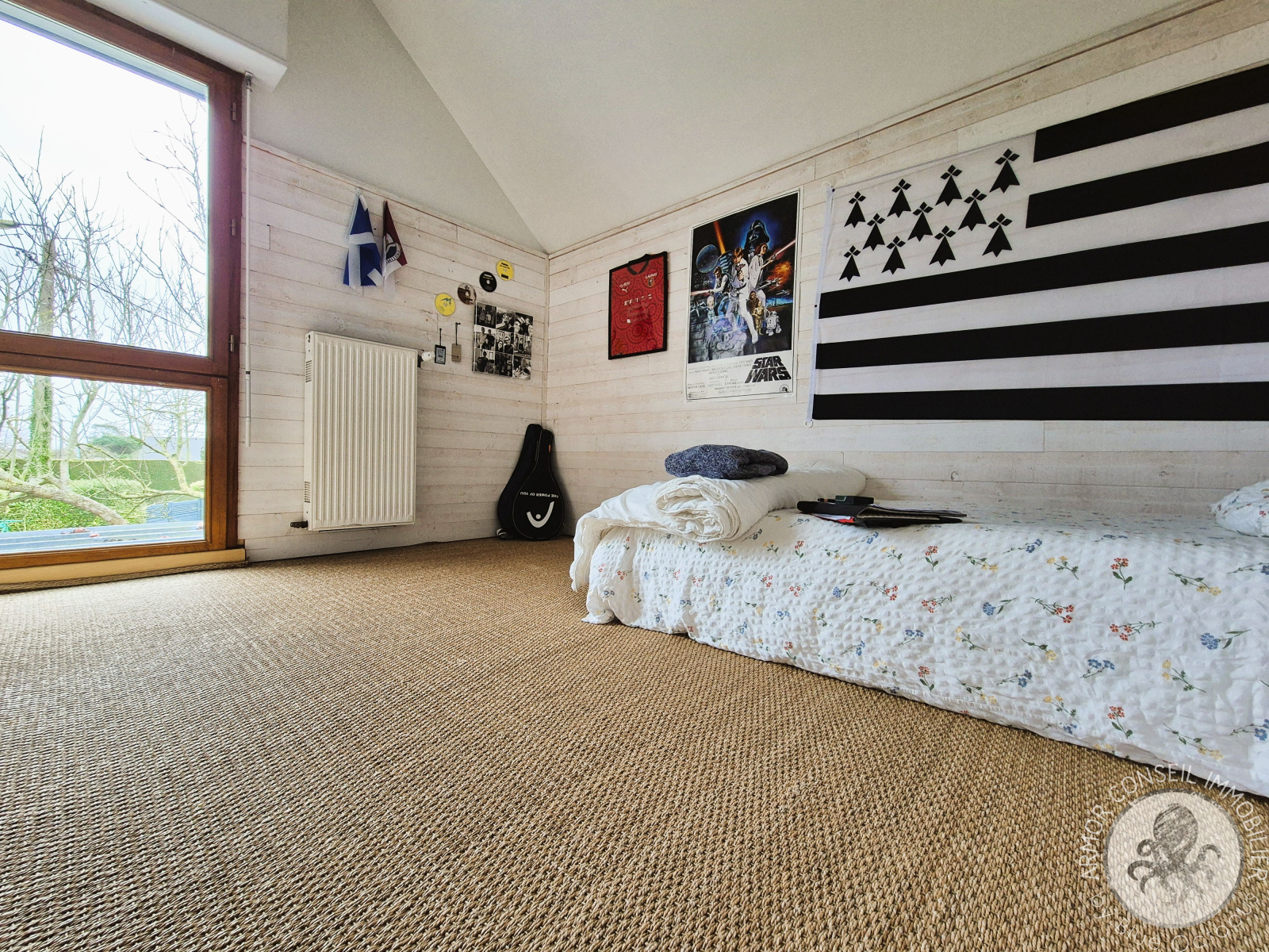 À l’étage, une spacieuse mezzanine dessert trois chambres, un bureau, une salle d’eau et un WC.