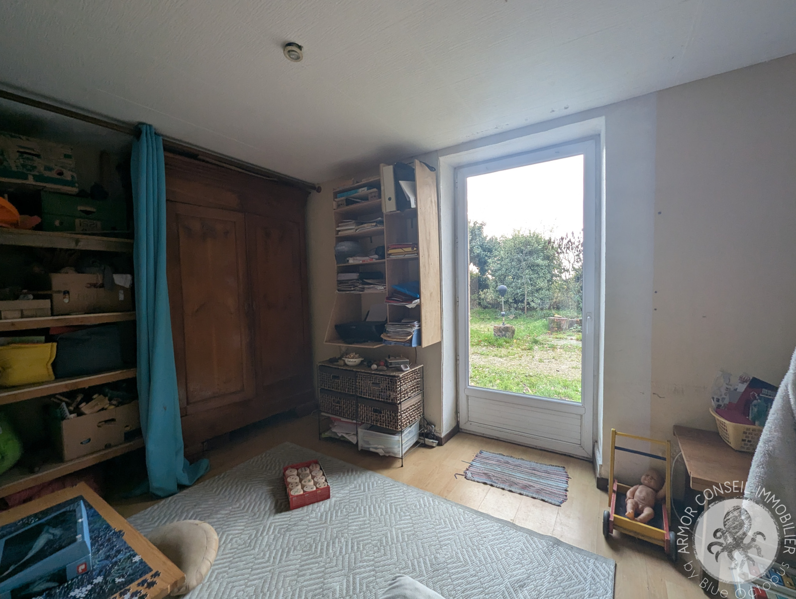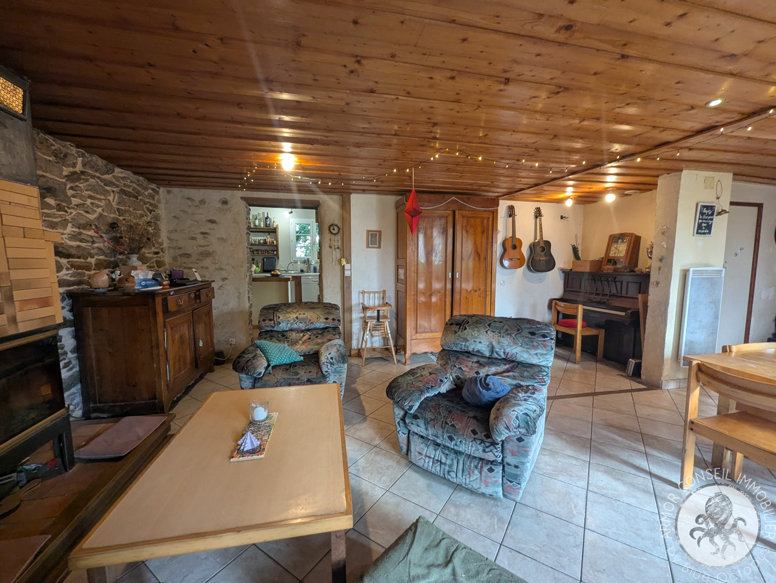 Exposée Sud, elle se compose d'une pièce de vie avec insert bois, une cuisine, une buanderie, un débarras, une salle de bains et 4 chambres de rez-de-chaussée.