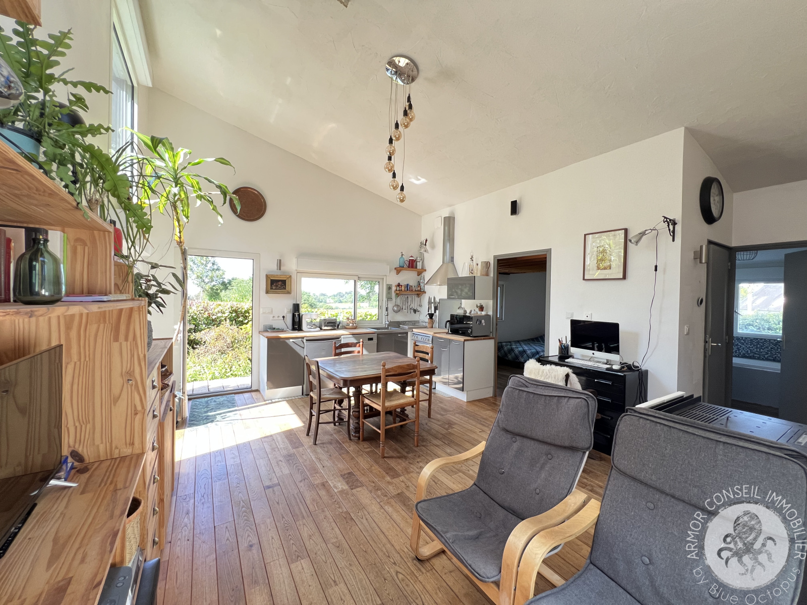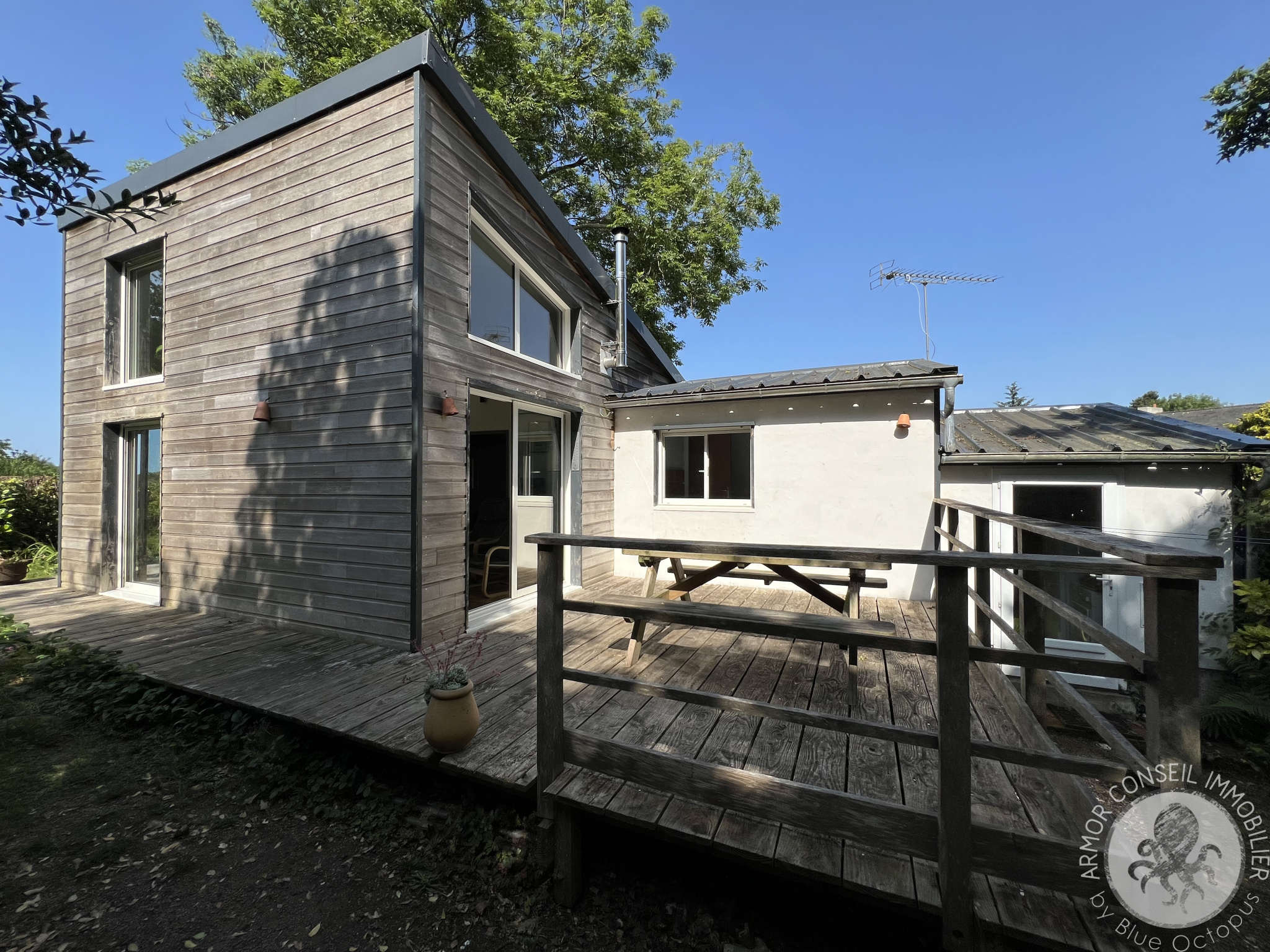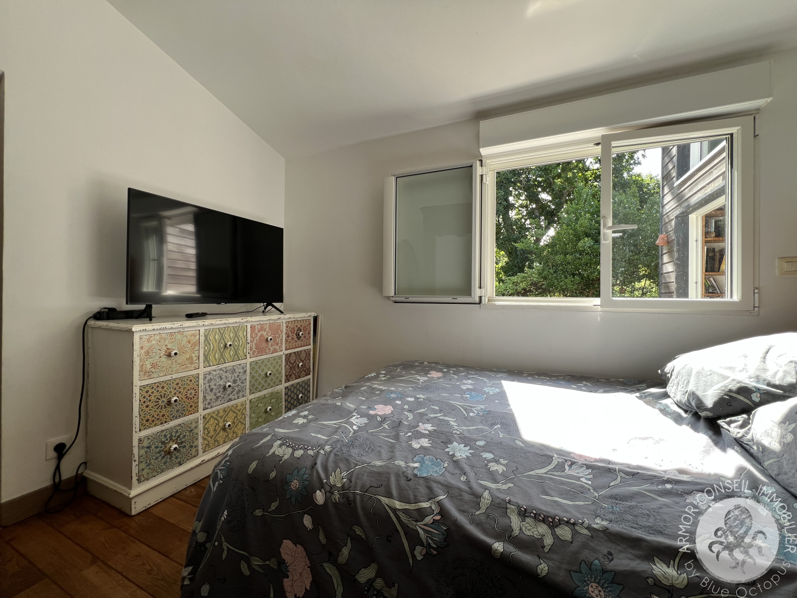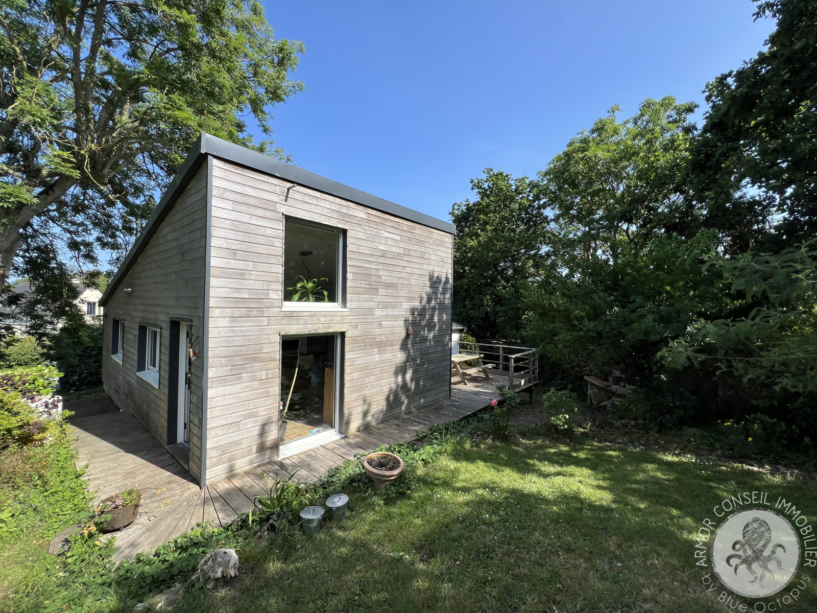 Située au bout d’une impasse, dans un écrin de verdure à l’abri des regards, cette charmante maison en bois d’environ 60 m² vous séduira par son atmosphère chaleureuse, son calme absolu et sa vue lointaine sur la mer.