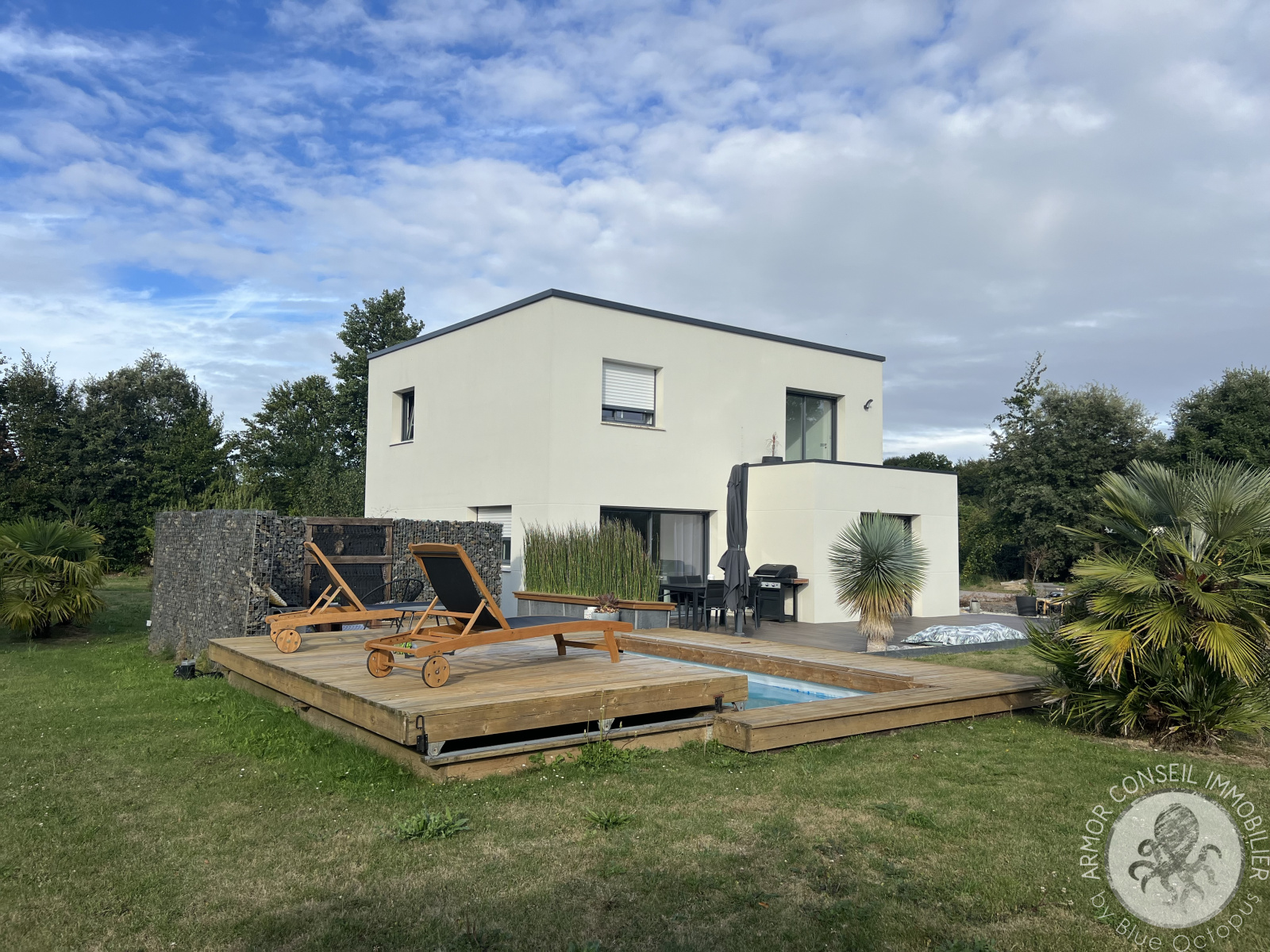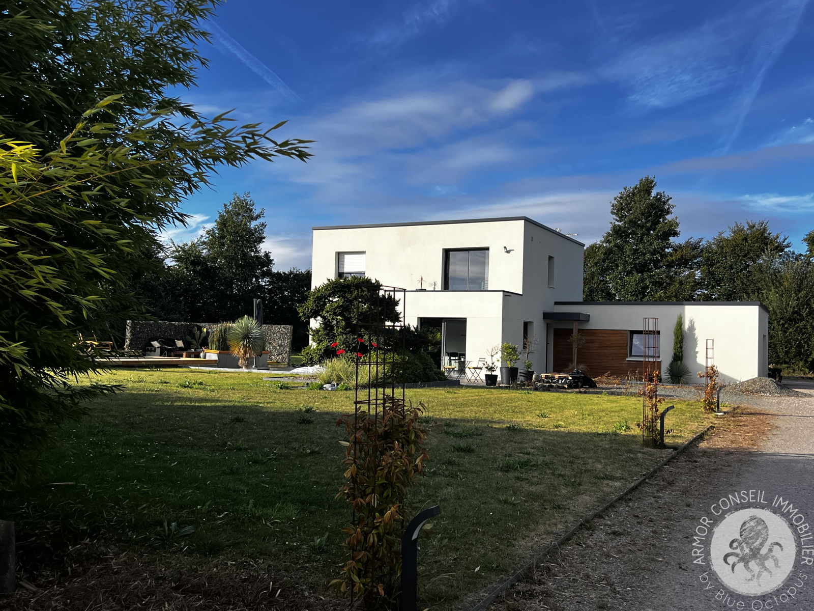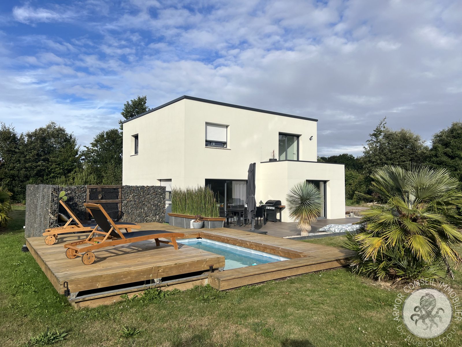 Ruca (22550)ARMOR CONSEIL IMMOBILIER: Située dans un petit hameau, Patricia DIBONNET vous propose de découvrir cette magnifique contemporaine spacieuse et lumineuse offrant une belle surface habitable de 138 m². Exposée Sud-Ouest, elle est composée d'une entrée avec placard, cuisine aménagée et équipée, salon-séjour, quatre chambres dont une au rez-de-chaussée avec salle d'eau privative, une salle de bains, espace mezzanine pour bureau, garage de 40 m², terrasse, piscine chauffée et balcon. Le tout implanté sur un beau terrain aménagé et clôturé d'environ 2 980 m².