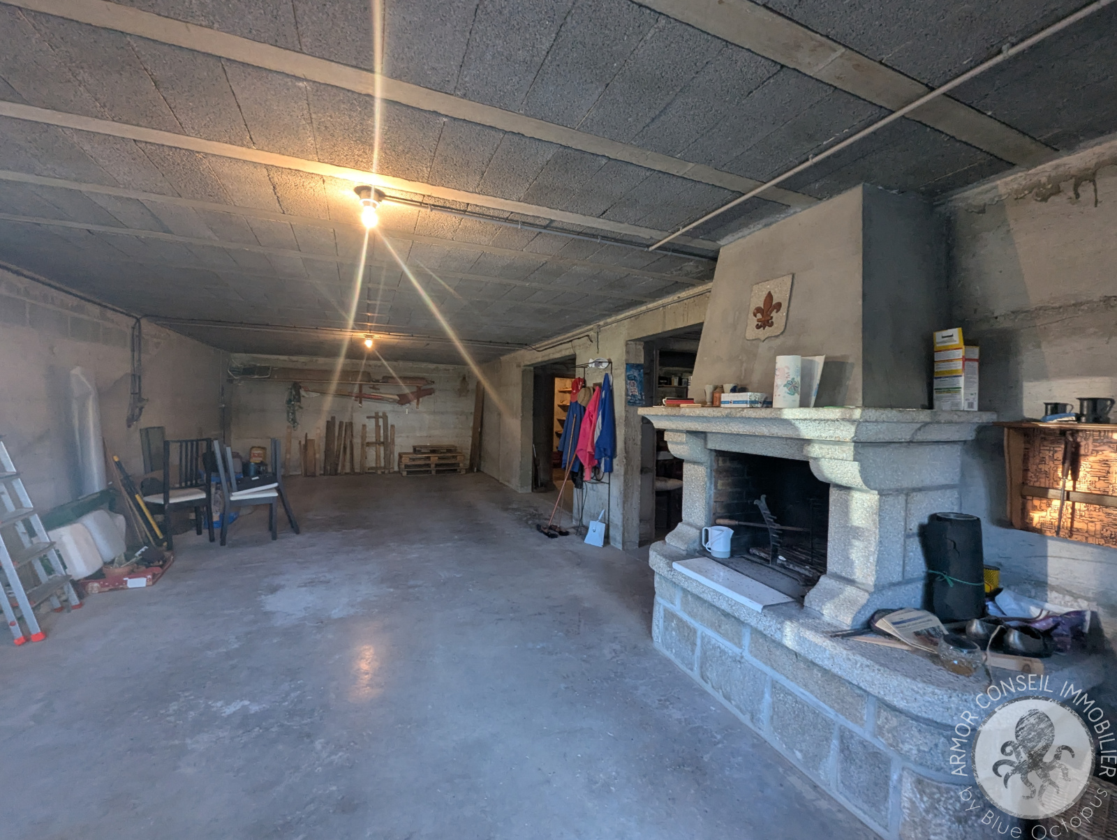 Le sous-sol total comprend un garage avec cheminée, un espace laverie, un atelier et une cave à vin, idéal pour les amateurs et les besoins de stockage.